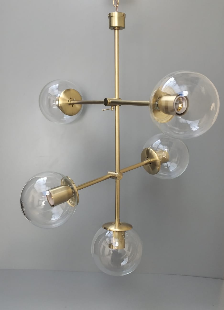 Araña vertical - 5 luces - globos de 15cm - Vidrios transparentes - Brazos con movimiento - accesorios dorado mate
