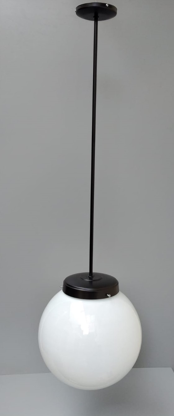 Colgante globo de 18cm, vidrio opal blanco brillante, modelo grifa alta, accesorios negros, barral de 70cm