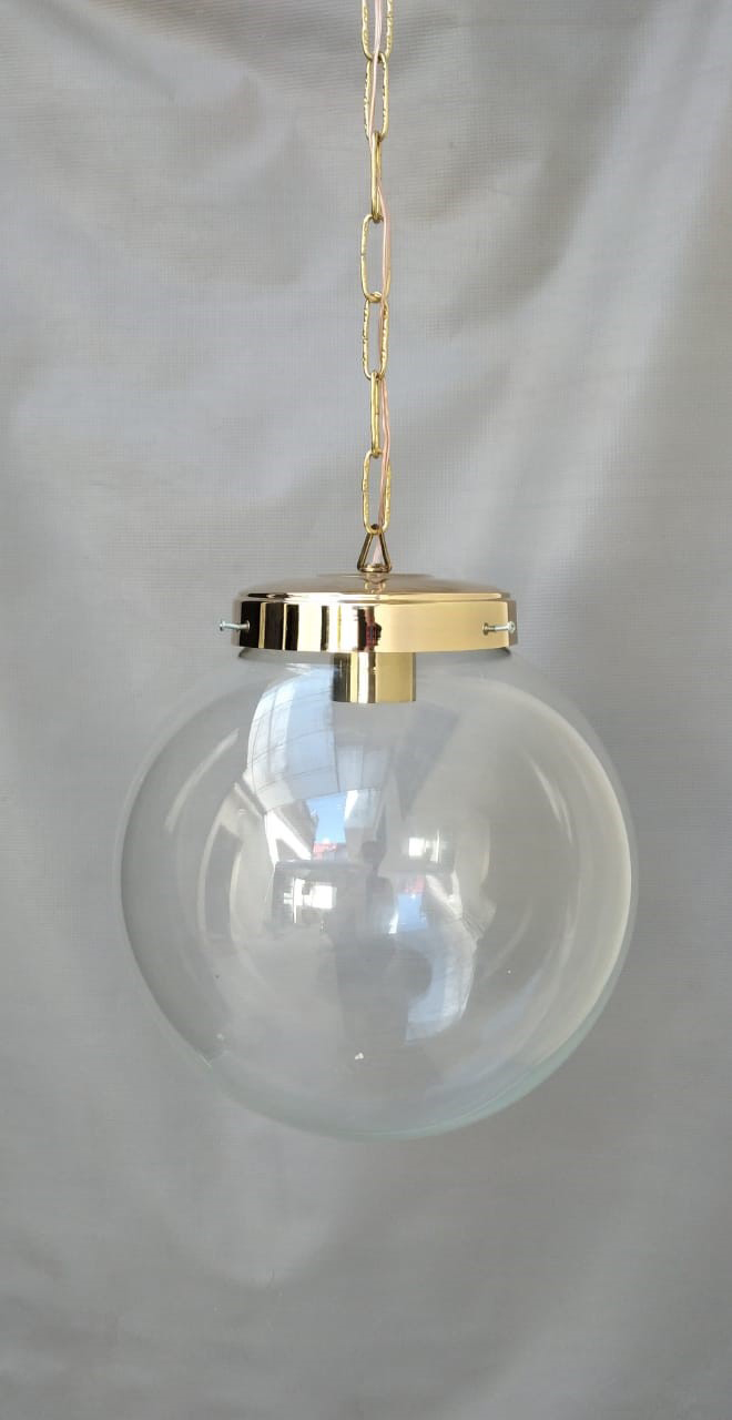 Colgante globo de 30cm, vidrio transparente, modelo grifa alta, accesorios y cadena dorados
