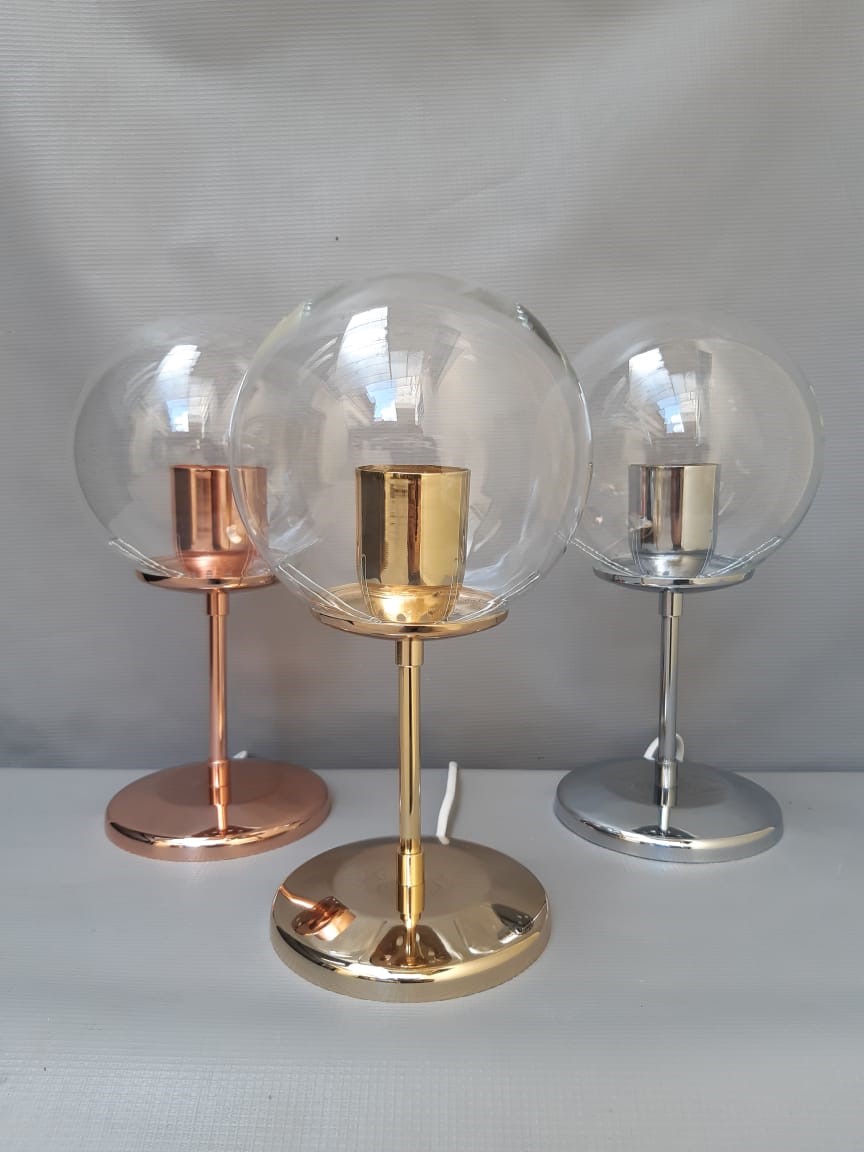 Veladores altos - Linea globos transparentes de 15cm, colores disponibles en: cobre, dorado, cromado y negro